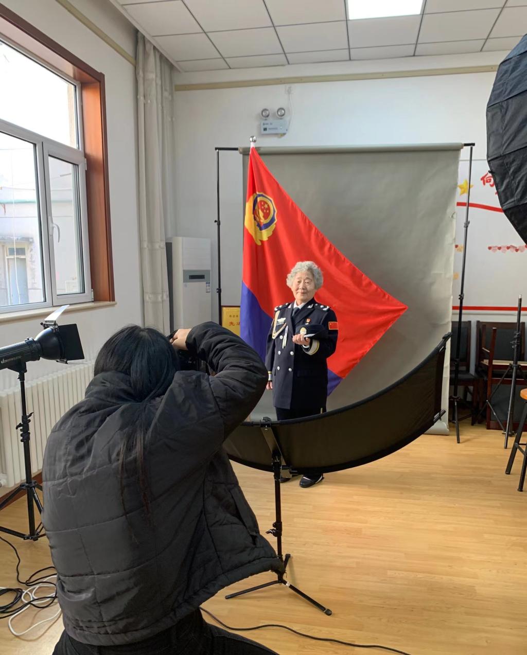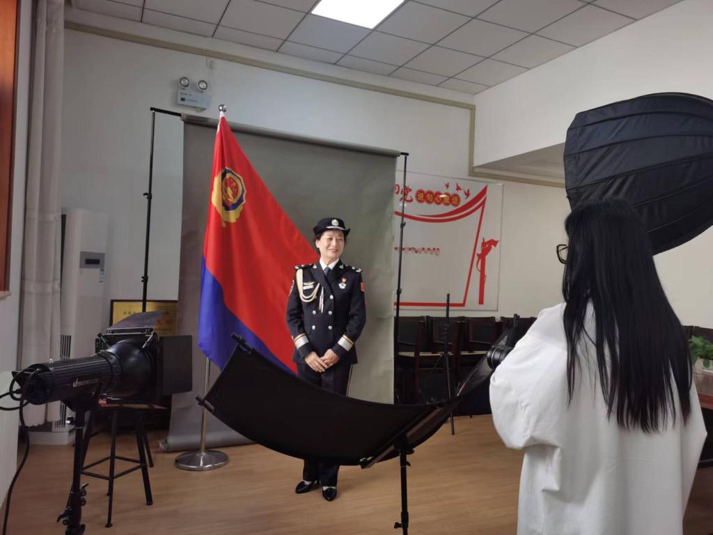 摄影棚内,明黄的灯光将中国人民警察警旗照耀得格外鲜艳、庄重。摄影师专业,老教师配合,拍摄工作有条不紊地进行着,为每一位老教师照两张个人照、一张家庭合照。