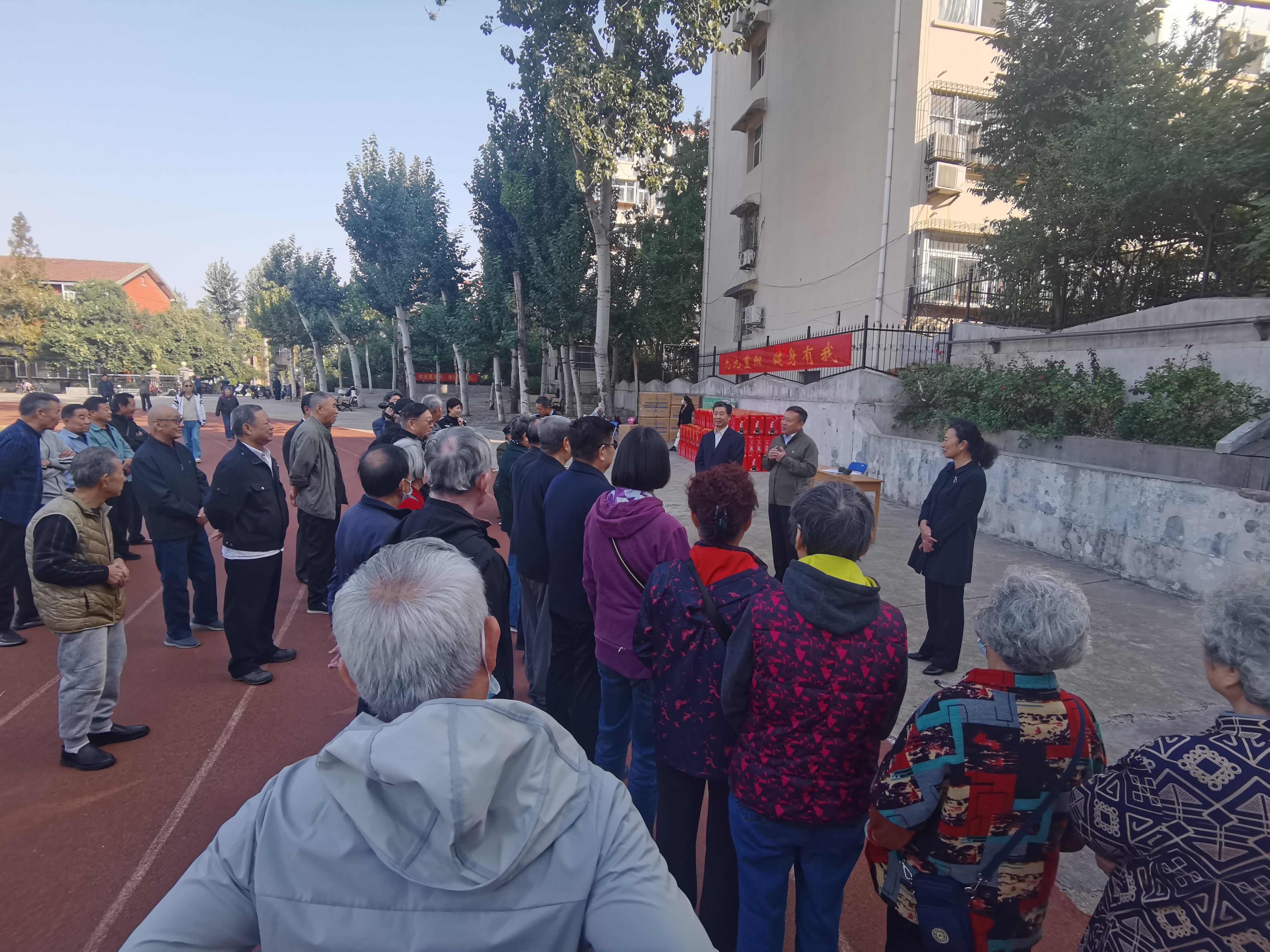 在文东校区警训场,刘福宏向参加重阳节健身游园活动的广大离退休老同志送上节日的祝福和问候,感谢大家多年来为学校的发展做出的奉献,并表示学校党委将一如既往地尊重老同志、爱护老同志,重视发挥老同志作用。离退休老同志们对学校党委给予老同志的关心关爱表示感谢,表示将继续发挥余热,积极为学校高质量发展贡献力量。