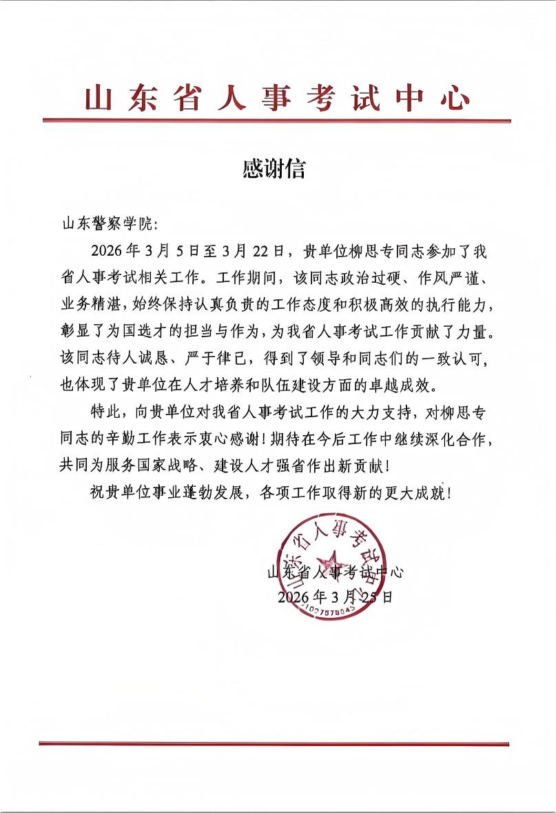 近日,学校离退休工作处收到山东省人事考试中心的感谢信,对我校退休干部柳思专同志参加省人事考试期间的相关工作表示感谢。感谢学校对省人事考试工作的大力支持,对柳思专同志的辛勤工作表示衷心感谢。期待在今后工作中继续深化合作共同为服务国家战略、建设人才强省作出新责献。